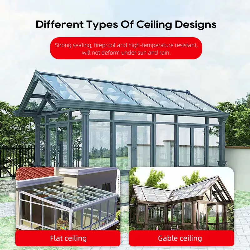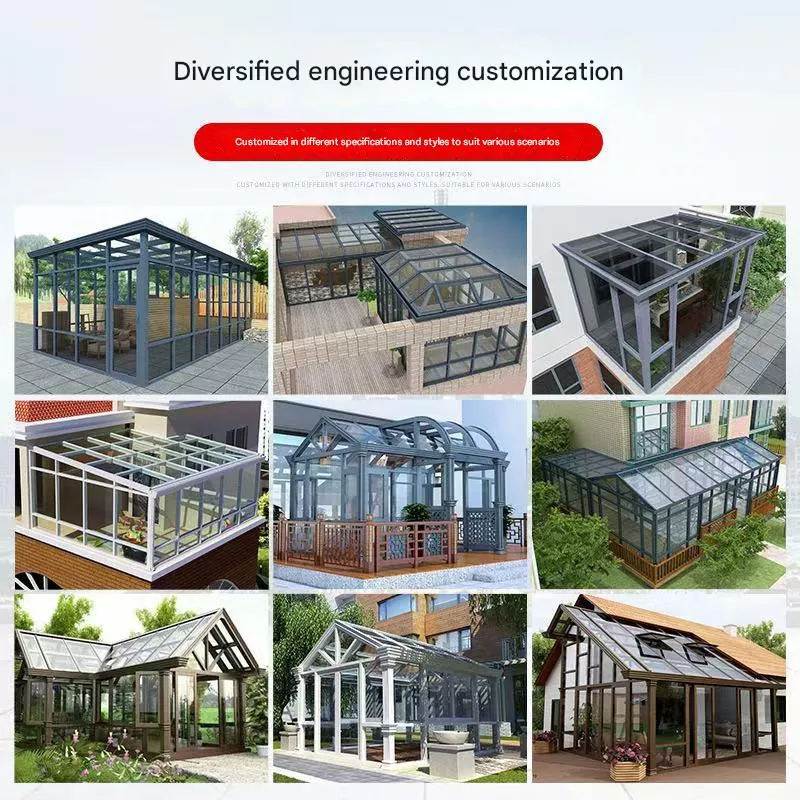 Күн бөлмесі а қабылдайды термиялық үзіліс алюминий жақтау + оқшауланған шыңдалған шыны құрылымы. Рамка модульдік жүйе арқылы жиналған бағандардан, арқалықтардан және диагональды тіректерден тұрады қоса алғанда, шатырдың бірнеше стильдерін қолдайды төбелер, жалпақ шатырлар және қисық шатырлар.