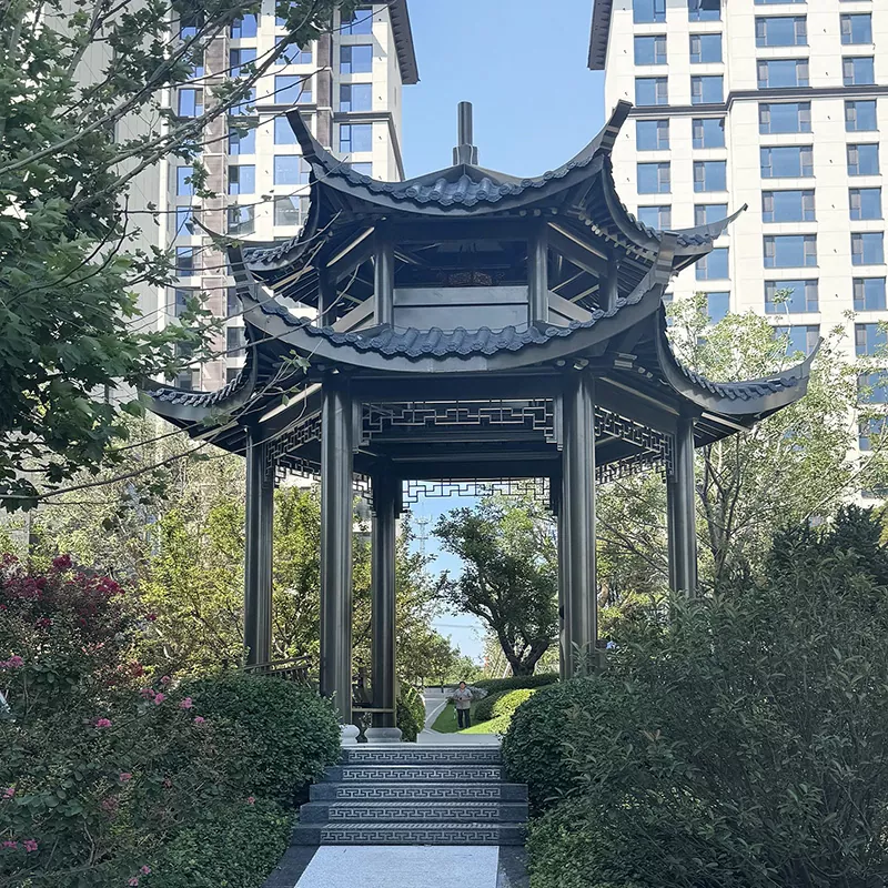 Ежелгі стильдегі реплика павильоны (5000×5000мм): 120×120мм күшейтілген тіректер, дугонг құрылымы, мөлдір ою ілулі компоненттері бар. Қосымша түрде мәдени орындар мен көрікті жерлерге жарамды түтік немесе жылтыратылған плиткаларды пайдаланады.